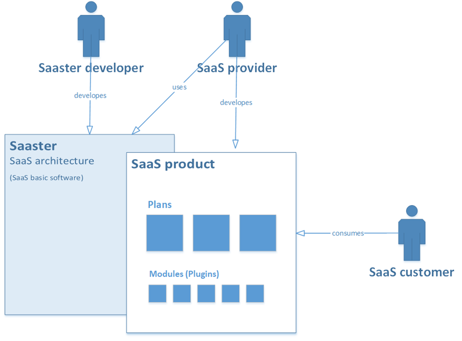 The role principle of saaster is most easily explained by means of the following sketch. There are three roles: Saaster developer, SaaS provider and SaaS customer.